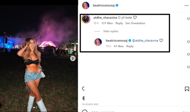 Ai i ka komentuar Beatrix në postimin e fundit në Instagram ku ajo shfaqet në ‘Sunny Hill’. “O yll bote” shkruan Atdheu teksa këngëtarja ia kthen me emojin e një zemre të bardhë.