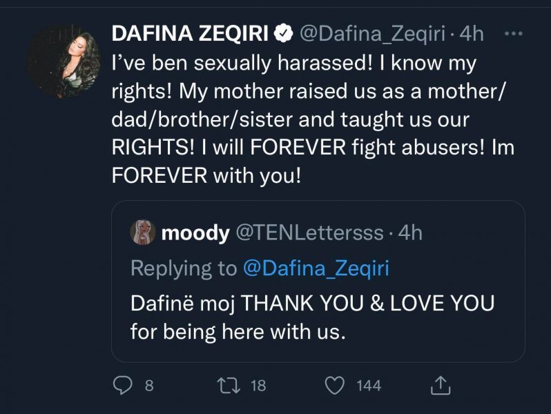 Më vonë përmes një statusi në Twitter Dafina ka zbuluar se ka qenë e ngacmuar seksualisht. “Jam ngacmuar seksualisht! I di të drejtat e mia! Nëna ime na ka rritur ne si nënë/baba/ vëlla/ motër dhe na ka mësuar për të drejtat tona. Do t’i luftoj përgjithmonë abuzuesit! Jam përgjithmonë me ju!”, ka shkruar Dafina pasi një fanse e falenderoi për mbështetjen.