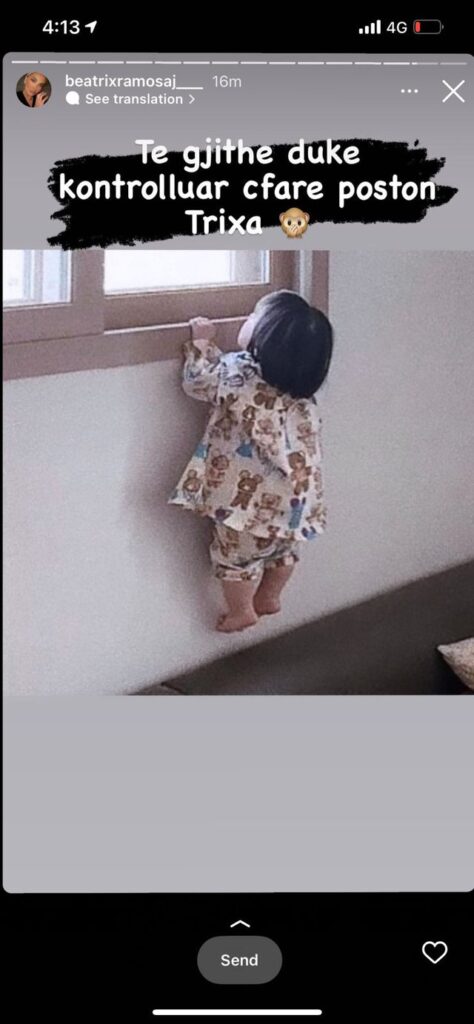 E ndërsa erdhi kjo deklaratë e fortë e aktorit, Beatrix postoi një foto të një vajze të vogël duke parë nga dritarja me kureshtje, me mbishkrimin “Të gjithë duke kontrolluar çfarë poston Trixa”.