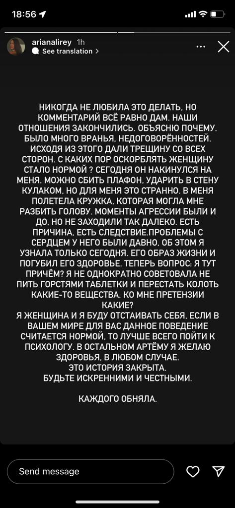 “Nuk kam dashur ta bëj këtë por do të jap gjithsesi një koment. Lidhja jonë ka mbaruar dhe unë do të shpjegoj pse. Kishte shumë gënjeshtra dhe keqkuptime. Nisur nga kjo, pati një krisje nga të gjitha anët. Që kur të ofendosh një grua është diçka normale? Ai më sulmoi sot. Ti mund të godasësh muret por është e çuditshme për mua nëse godas një mizë që më kalon mbi kokën time. Kishte momente agresioni më parë, por gjërat nuk shkuan shumë larg. Ai ka probleme me zemrën prej një kohe të gjatë dhe unë e zbulova këtë sot. Stili i tij i jetesës i shkatërroi shëndetin. Tani pyetja është: Çfarë kam unë të bëj me këtë? Unë e kam këshilluar vazhdimisht që të mos marrë lëndë narkotike. Unë jam një grua dhe qëndroj për veten time, nëse në botën tënde kjo sjellje është normale për ty, duhet të konsultohesh me një psikiatër. Të uroj shëndet, gjithsesi kjo histori është e mbyllur. Jini të sinqertë dhe të drejtë të gjithë. Ju përqafoj”– shkruan modelja Ariana Lirey.