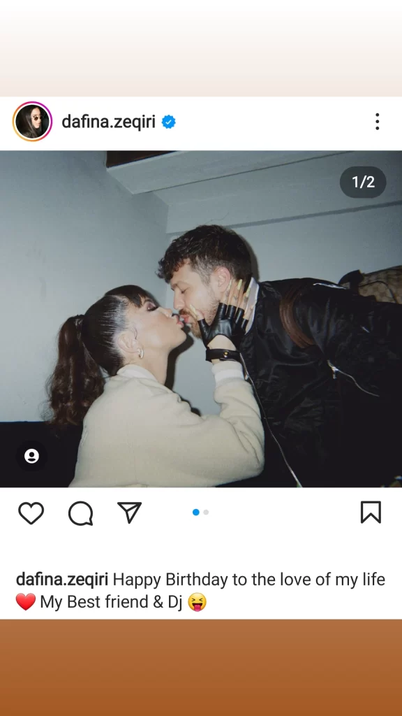 Ndërsa në një video në InstaStory, Dafina dhe DJ Geek shihen teksa shëtisnin rrugëve me një motoçikletë, teksa këngëtarja shkruan: “Urime shpriti jem, të dua”.