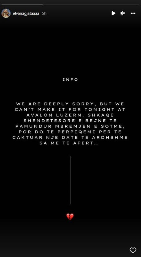 “Na vjen shumë keq t’ju njoftojmë se koncerti në Avalon Luzern nuk do të zhvillohet. Shkaqe shëndetësore e bëjnë të pamundur mbrëmjen e sotme, por do të përpiqemi për të caktuar një datë të ardhshme sa më të afërt”- thuhej në postim.
