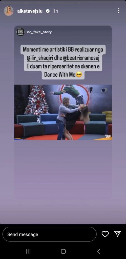 Gjithashtu ajo ripostoi në Instagram një video të publikuar nga një faqe fansash ku shihet Beatrix dhe Iliri duke kërcyer në ‘Big Brother VIP’. Krah postimit shkruhet: “Momenti më artistik i BBVIP nga Iliri dhe Beatrix. E duam të realizuar në skenën e ‘Dance With me’”. Fakti që moderatorja e ka rishpërndarë postimin na bëri të mendojmë se Beatrix do jetë pjesë e emisionit. Dhe me sa duket kjo u konfirmuar me një foto të fundit që po qarkullon.