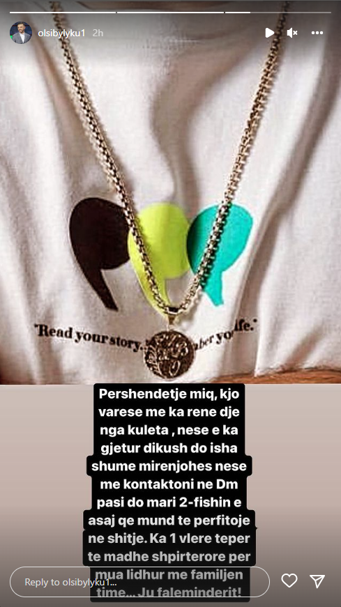 “Përshëndetje miq, kjo varëse më ka rënë dje nga kuleta, nëse e ka gjetur dikush do të isha mirënjohës nëse më kontaktoni në Dm pasi do marri 2-fishin e asaj që mund të përfitojë në shitje.