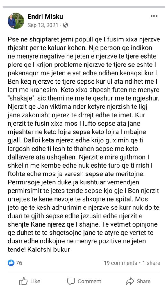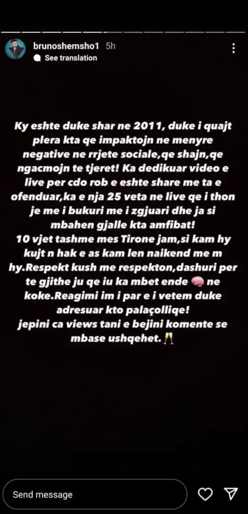 “Ky është duke shar që në, duke i quajtur plehra këta që impaktojnë në mënyrë negative në rrjetet sociale, që shajnë, që ngacmojnë të tjerët. Ka dedikuar live e për çdo rob është share me ta dhe është ofenduar, ka e nja 25 nja veta live që thonë se je më i bukuri dhe me i zgjuari dhe ja si mbahen gjallë këta amfiba!