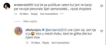 Edhe pse nuk është në stilin e saj, Alketa vendosi t’i përgjigjej komentit negativ ku u shpreh: