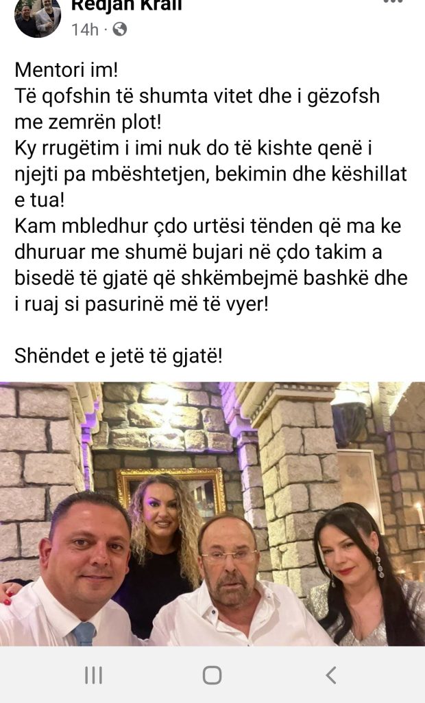 Të qofshin të shumta vitet dhe i gëzofsh me zemrën plot! Ky rrugëtim i imi nuk do të kishte qenë i njejti pa mbështetjen, bekimin dhe këshillat e tua! Kam mbledhur çdo urtësi tënden që ma ke dhuruar me shumë bujari në çdo takim a bisedë të gjatë që shkëmbejmë bashkë dhe i ruaj si pasurinë më të vyer! Shëndet e jetë të gjatë”, shkruan Krali. Ashtu si shihet festa ka patur më shumë se 20 persona dhe të gjithë i përkasin rrethin të ngushtë të familjes. Që pas largimit të tij nga politika, daljet publike të Nanos kanë qenë të rralla. Do të duhej kjo festë e 70-të vjetorit për të zbuluar imazhet e reja të tij, por edhe të bashkëshortes së tij, Xhoana Nano.