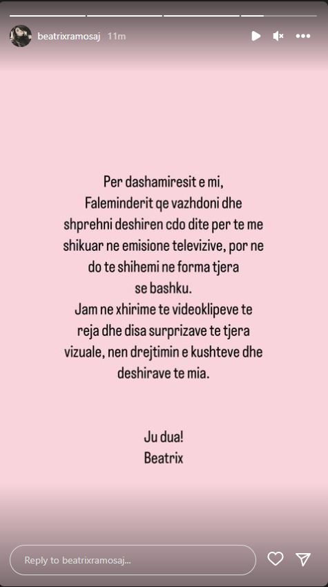 “Për dashamirësit e mi. Faleminderit që vazhdoni të shprehni dëshirën çdo ditë për të më shikuar në emisione televizive, por ne do të shihemi në forma tjera së bashku. Jam në xhirime të videoklipeve të reja dhe disa surprizave të tjera vizuale, nën drejtimin e kushteve dhe dëshirave të mija. Ju dua! Beatrix,”-shkruan Ramosaj.