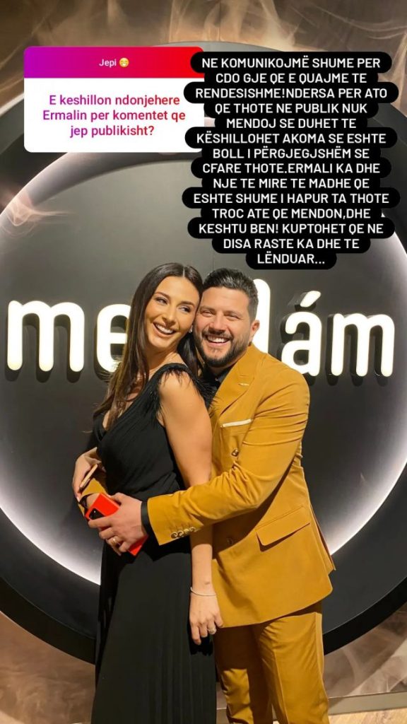Në një bisedë virtuale që ka realizuar me ndjekësit në Instagram, Amarda Toska ka folur dhe për ngjarjen më të fundit në të cilën u përfshi bashkëshorti i saj, Ermal Mamaqi. Njëri prej ndjekësve e ka pyetur Amin nëse “e këshillon ndonjëherë Ermalin për komentet që jep publikisht?”