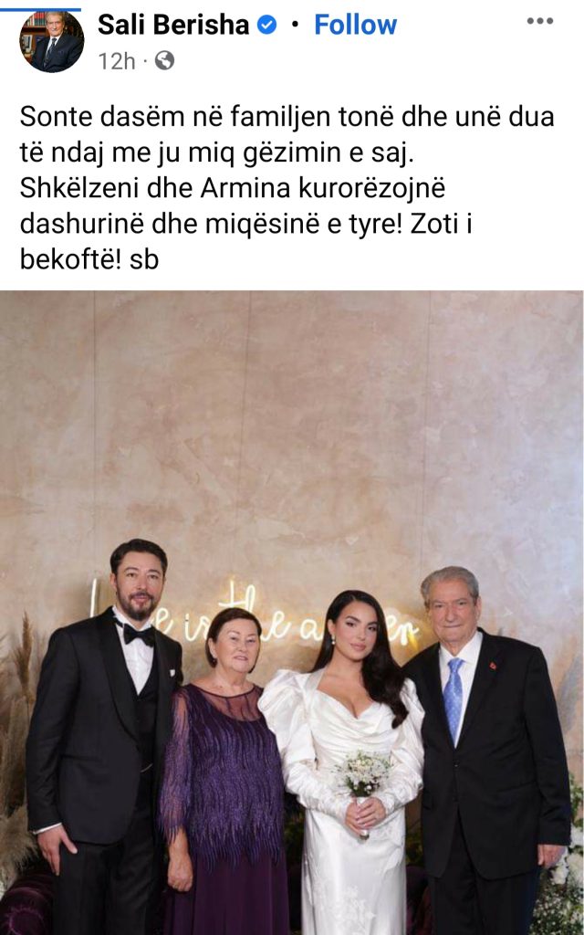 Shkëlzeni dhe Armina kurorëzojnë dashurinë dhe miqësinë e tyre! Zoti i bekoftë!”, shkruan Sali Berisha.