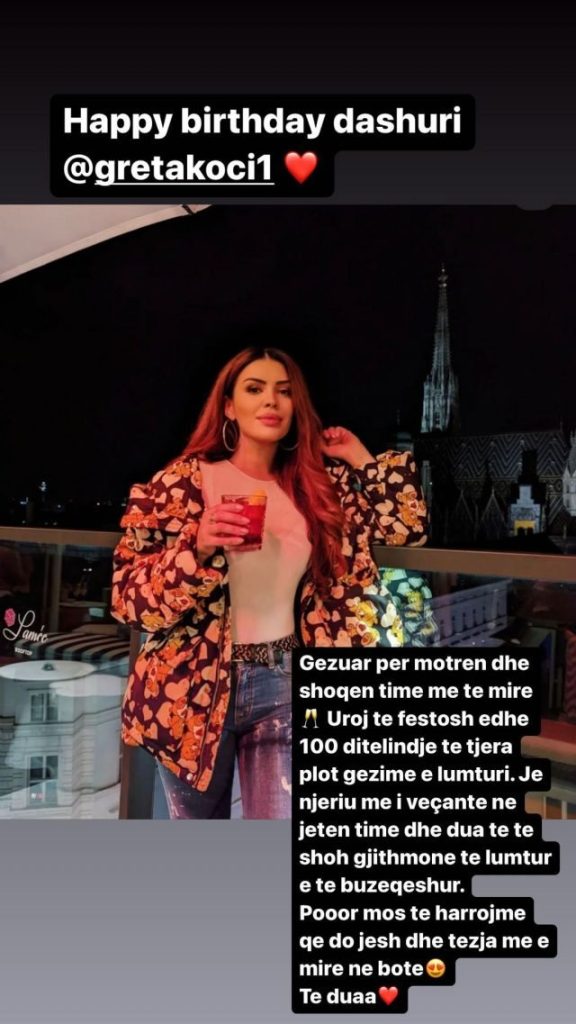 “Gëzuar ditëlindjen dashuri. Gëzuar për motrën dhe shoqen time më të mirë. Uroj të festosh edhe 100 ditëlindje të tjera plot gëzime dhe lumturi. Je njeriu më i veçantë në jetën time dhe dua të të shoh gjithmonë të lumtur e të buzëqeshur. Por mos të harrojmë që do të jesh dhe tezja më e bukur në botë. Të dua”.