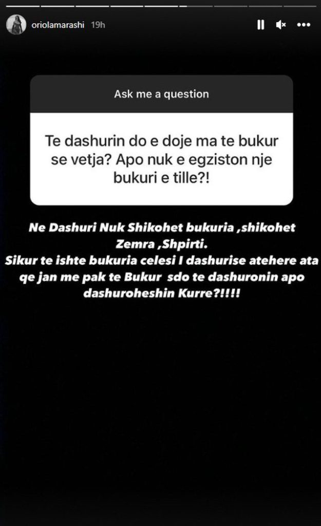 “Në dashuri nuk shikohet bukuria shikohet zemra shpirti. Sikur të ishte bukuria çelësi i dashurisë atëherë ata që janë më pak të bukur s’do të dashuronin apo dashuroheshin kurrë?!“, shkruan Oriola.
