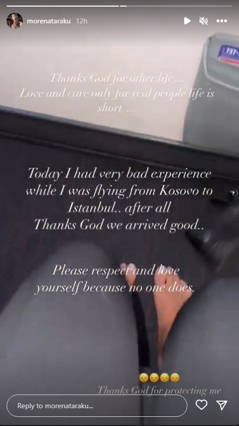 Morena Taraku është përballur me një situatë të pakëndshme në avion. Këngëtarja dhe modelja nga Kosova ka treguar përmes një postimi në Instagram se ka kaluar një eksperiencë të keqe teksa po udhëtonte drejt Stambollit por pa ndarë më shumë detaje të hollësishme.