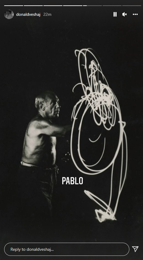 Ndërsa, sot Veshaj postoi disa imazhe bardhë e zi të piktorit të famshëm, Pablo Picasso dhe një në të cilin shihet edhe ai teksa pikturon në një pasqyrë.