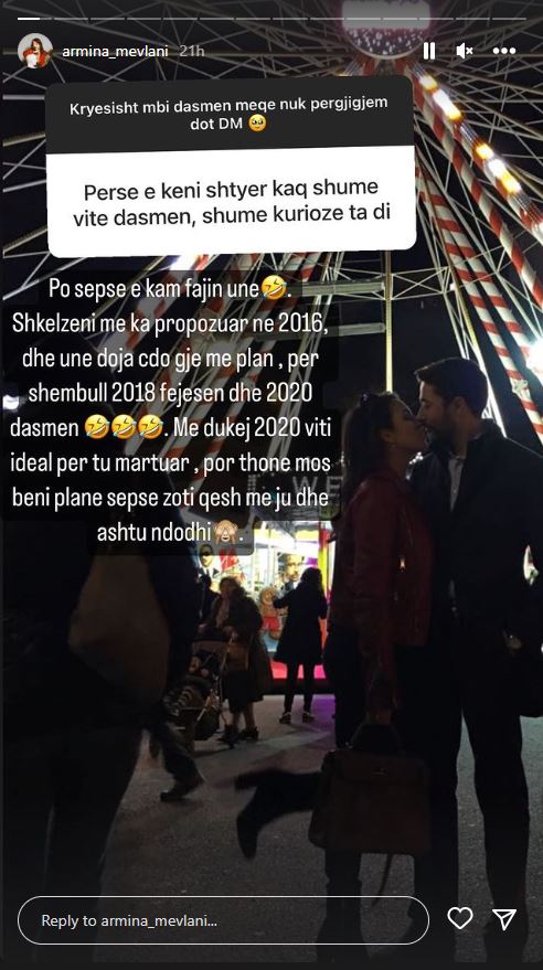 Armina Mevlani dhe Shkëlzen Berisha kurorëzuan dashurinë e tyre në martesë më 25 shtator. Ata organizuan një dasmë spektakolare me 300 të ftuar. Mirëpo, kurioziteti i madh i fansave ka qenë se pse pikërisht çifti u martuan pas 9 vitesh lidhje. Kjo pyetje i është bërë edhe Arminës në një “intervistë” me ndjekësit në Instagram, ku ajo ka treguar se në fakt ‘ka qenë faji i saj’.