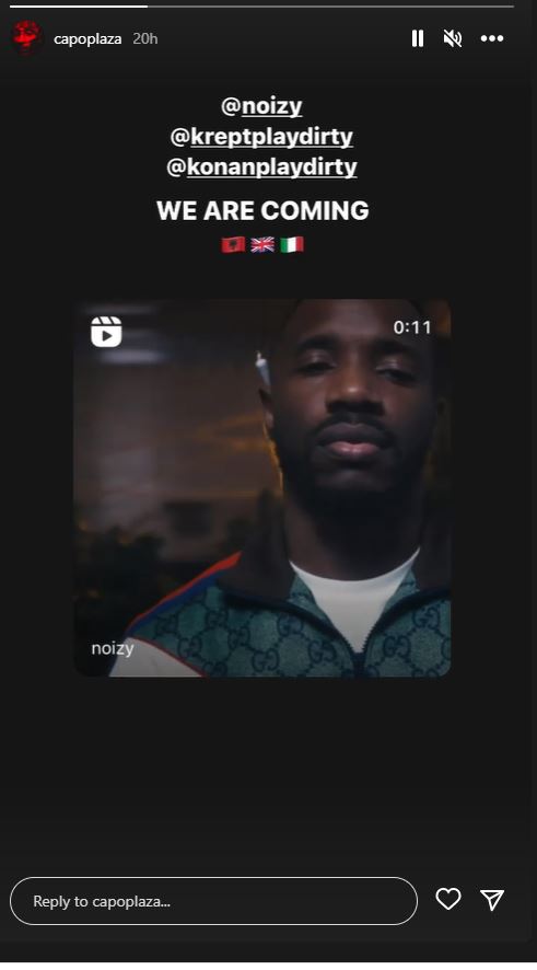 Së fundmi, Noizy ka paralajmëruar edhe një bashkëpunim me reperë ndërkombëtar. Përmes një video të shkurtër të publikuar në Instagram, ai ka zbuluar që bëhet fjalë për Capo Plaza dhe Krept&Konan.