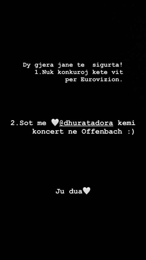 Elvana Gjata ka sqaruar se nuk do të marrë pjesë në Festivalin e Këngës. “Nuk konkurroj këtë vit për Eurovision”, ka shkruar këngëtarja në Instastory. Ishte faqja “Eurovision Kosovo” që shkroi përmes një postimi se nga burime jo zyrtare kishte mësuar se ajo dhe Dhurata Dora synonin Eurovisionin.
