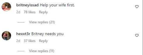 “Ti mbështet Iranin dhe në të njëjtën kohë gruaja jote e tregon trupin e zhveshur në plazh” , “Ndihmoni gruan tuaj fillimisht, pastaj Iranin”, shkruajnë të tjerë. Së fundmi ai ka mbajtur një qëndrim për fotot që publikon Britney, duke thënë se “është thjesht një shprehje lirie, pas 13 viteve të jetës konservatore”.