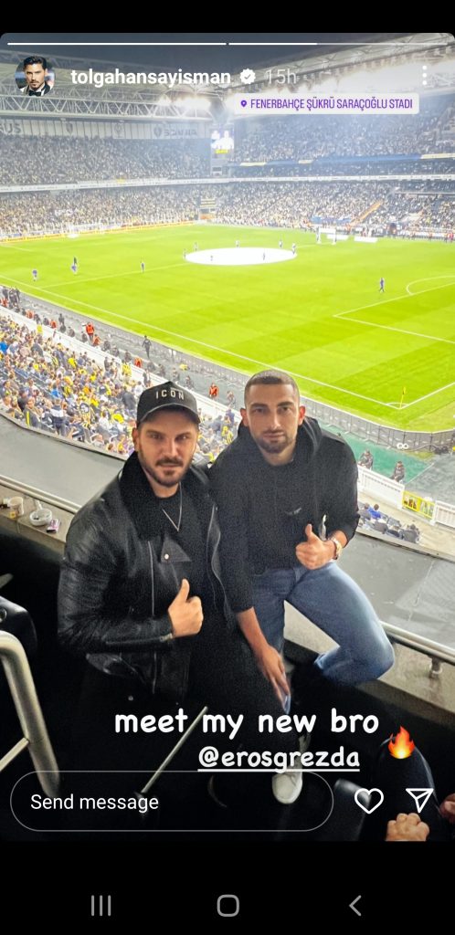 Ka qenë bashkëshorti i Almedës që ka publikuar një foto me Erosin, duke zbuluar kështu më shumë rreth marrëdhënies se ndërtuar së fundmi. Tolgahan Sayisman ka ndarë një foto në Instagramin e tij ku duket me Eros Grezdën në stadiumin e Stambollit.