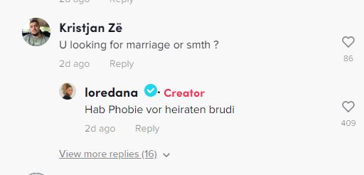 Loredana ka publikuar në Tiktok një video ku shihet duke kënduar “Tomorrow 2” nga Cardi B dhe GloRilla. Në sektorin e komenteve një ndjekës e ka pyetur reperen nëse ‘po mendon të martohet’ dhe mesa duket në këtë koment Loredana sapo zbuloi ‘fobinë’ e saj.