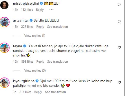 “Nuk të njoh por më ke lënë një mbresë shumë të veçantë me këtë që ke shkruar. Lum familja që të paska. Suksese”, i shkruan Oriola. “Elhamdulilah qe je njeri kaq i thjesht edhe rri qishtu qysh je se gjithmon Zoti ka me t’shperbly veq me t’mirat e tij e sidomos kur e ki njetin e mir me i ndihmu familjes Allahu t’mbulon me t’mirat e tij.”, shkruan Aida Doçi.