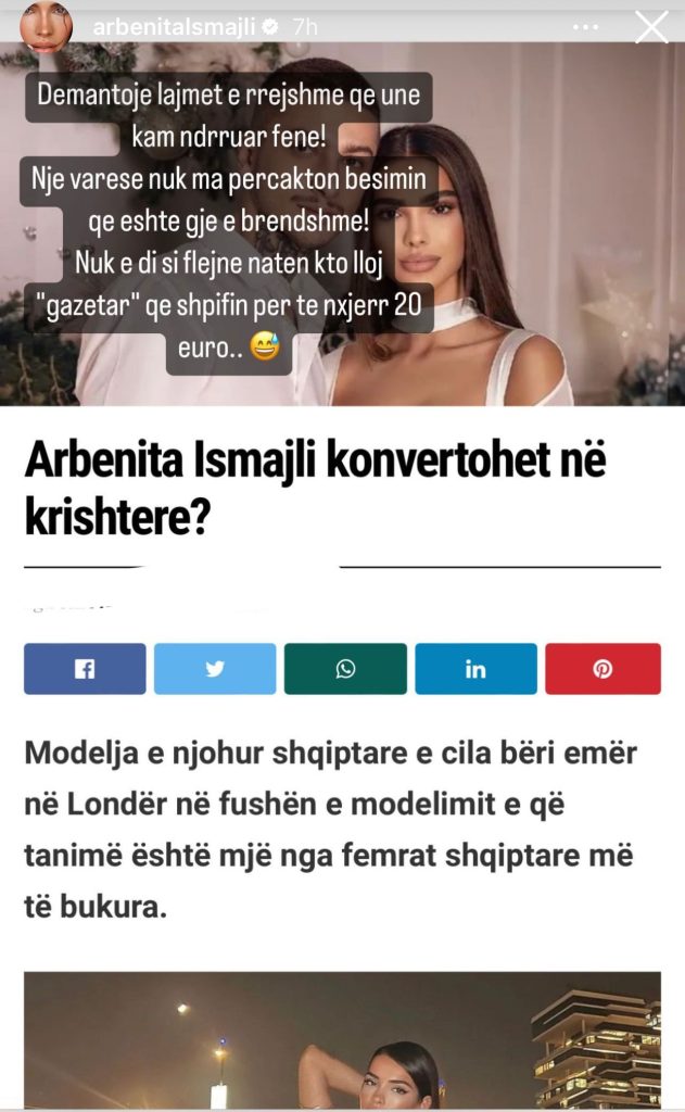 “Demantoje lajmet e rrejshme qe une kam ndrruar fene! Nje varese nuk ma percakton besimin qe eshte gje e brendshme! Nuk e di si flejne naten kto lloj gazetar” qe shpifin per te nxierr 20 euro..”-shkruan Arbenita.