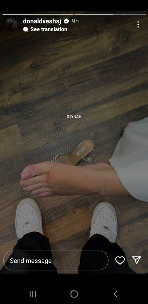 Pasi mbrëmja përfundoi, ai publikoi një foto të këmbëve të moderatores. Ashtu si shihet, Borën e kanë vrarë këpucët me taka që ka mbajtur veshur. Kaq ka mjaftuar që aktori i humorit ta ironizojë në rrjetet sociale. “Gjynah,”- shkroi Veshaj krahas Instastory-t, ku dukeshin këmbët e vrara të Borës. Kujtojmë se edhe natën e parë të spektaklit, Donaldi ishte me Borën përgjatë gjithë kohës, duke publikuar video ‘funny’.