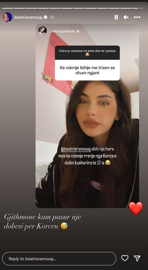 Madje, së fundmi, Aleksia është pyetur në Instagram nësë ka ndonjë lidhje me Trixën se ngjajnë shumë dhe ajo nuk ka nguruar të përgjigjet. Madje, bukuroshja ka bërë tag këngëtaren, duke shkruar me shaka: “Beatrix shih një herë mos ke ndonjë rrënjë nga Korça e dalim kushërira të 17-a”.