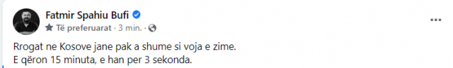 “Rrogat në Kosovë janë pak a shumë si veza e zier. E qëron 15 minuta, e han per 3 sekonda.”, ka shkruar aktori në ‘Facebook’, ku ka marrë komente të shumta dhe nga më të ndryshmet.