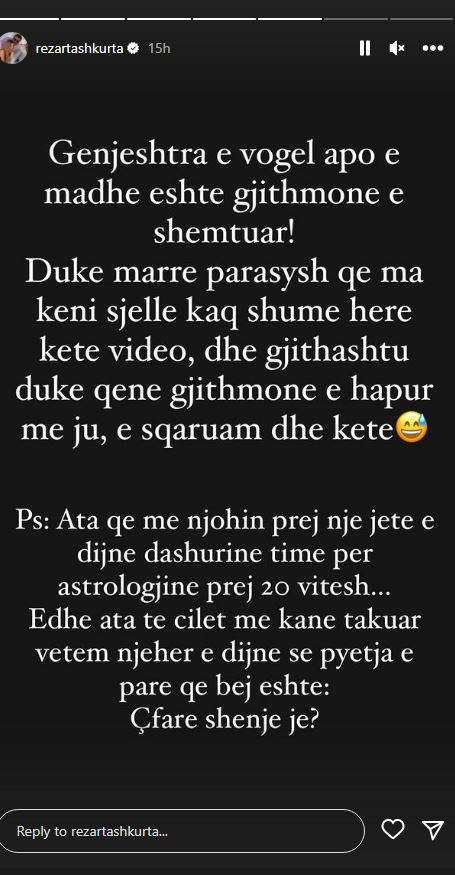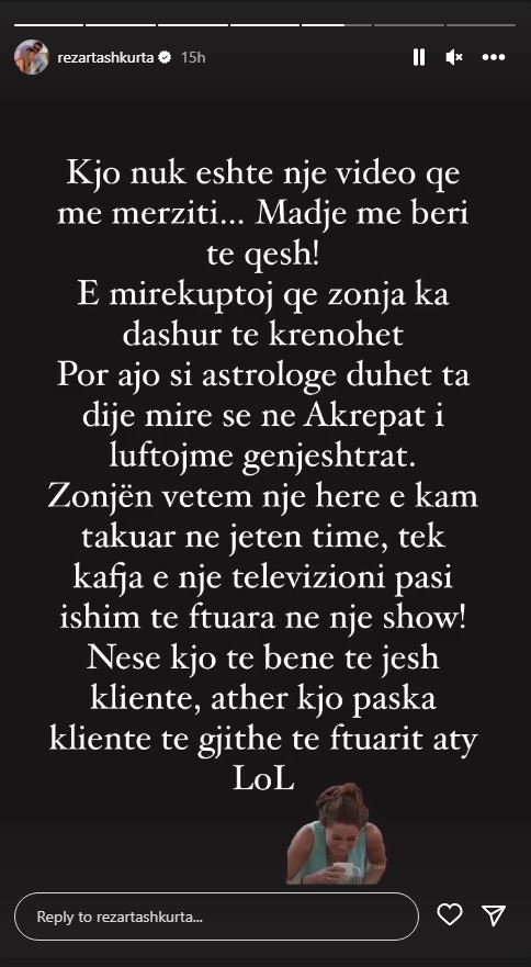 “Kjo nuk është një video që më mërziti… Madje më bëri të qesh! E mirëkuptoj që zonja ka dashur të krenohet. Por ajo si astrologe duhet ta dijë mirë se Akrepat i luftonë gënjeshtrat. Zonjën vetëm njëherë e kam takuar, tek kafja e një televizioni pasi ishim të fuara në një shoë! Nëse kjo të bën të jesh kliente, atëherë kjo paska kliente të gjithë të ftuarit aty!”- shkroi Rezarta.