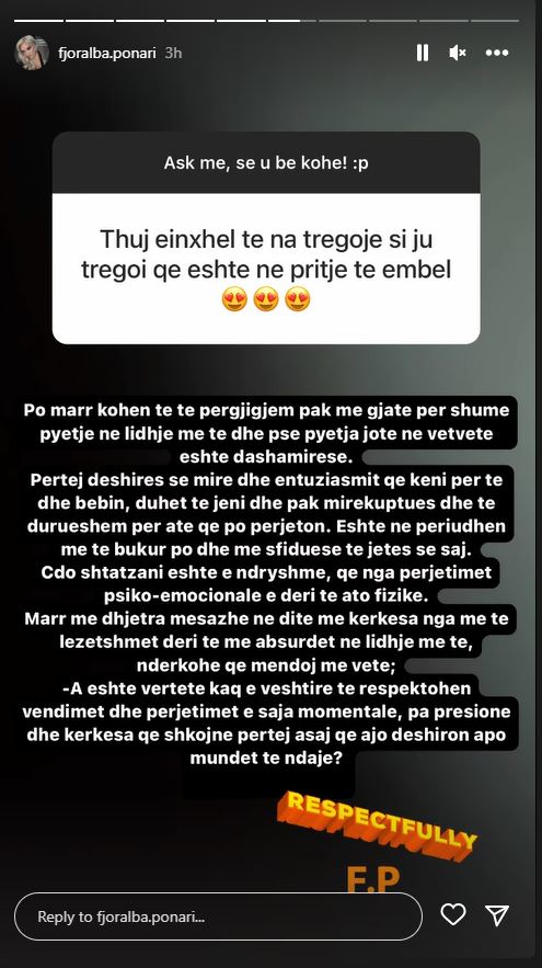 Së fundmi, dikush i ka drejtuar Fjoralbës një kërkesë, duke i shkruar: “Thuaj Einxhel të na tregojë, si ju tregoi që është në pritje të ëmbël”. Ndërsa moderatorja i kërkoi të gjithëve të kenë durim dhe të respektojnë gjendjen e Einxhel.