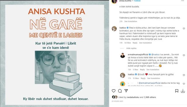 Ndërkohë, Ermali ia ka kthyer: “Iva zemër… Sa mirë që Anisa e botoi këtë libër se ti vdes për qenin… Më fal se unë kotmekot ndërhyra, se nuk kam lidhje më këtë punë por ngaqë jam fanËs i AnisësË. Por ty nuk duhet asnjë trajnim sepse ti ……..”, shkroi ai shoqëruar me një emoji me puthje.