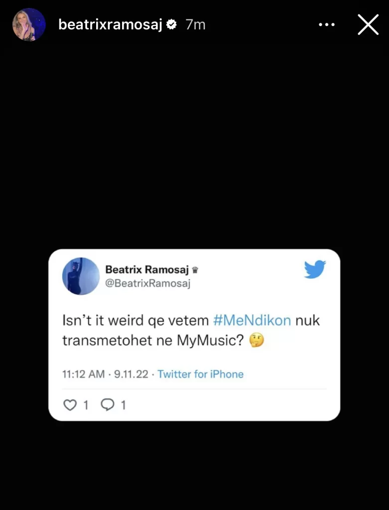 “Isn’t it weird që vetëm #MëNdikon” nuk transmetohet në MyMusic?”-shkruan Trixa në llogarinë e saj Twitter.