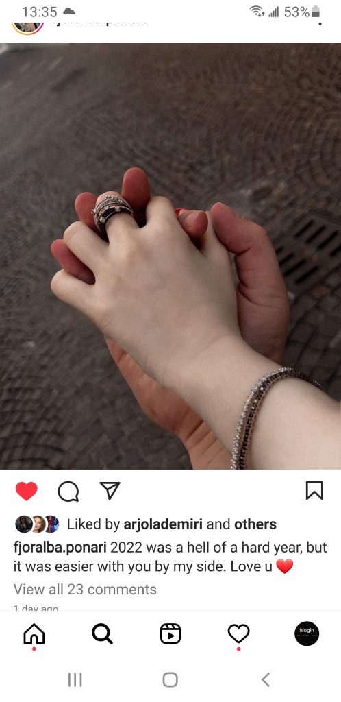 Fjoralba e mban shumë private lidhjen e saj dhe shumë rradhë herë poston foto me të dashurin e saj. Ditën e sotme bukuroshja ka postuar në Instagram një foto të dorës së saj dhe të tij të kapura fort me njëra-tjetrën dhe ka shkruar se si ka qenë ky vit për të.