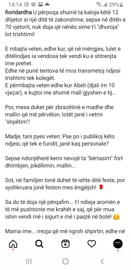 E përmbajta veten edhe kur Abeli (djali im 10 vjeçar), e kujtoi me shumë mall gjyshen e tij…Por, mesa duket për zbrazëtinë e madhe dhe mallin që më përvëlon, lotët janë i vetmi “shpëtim”!