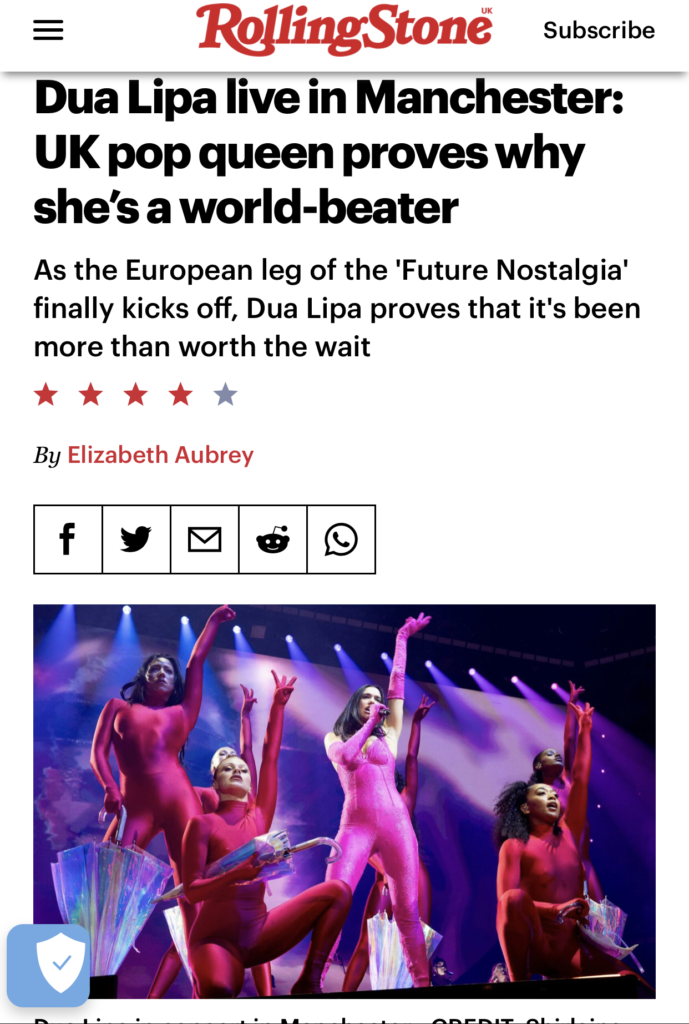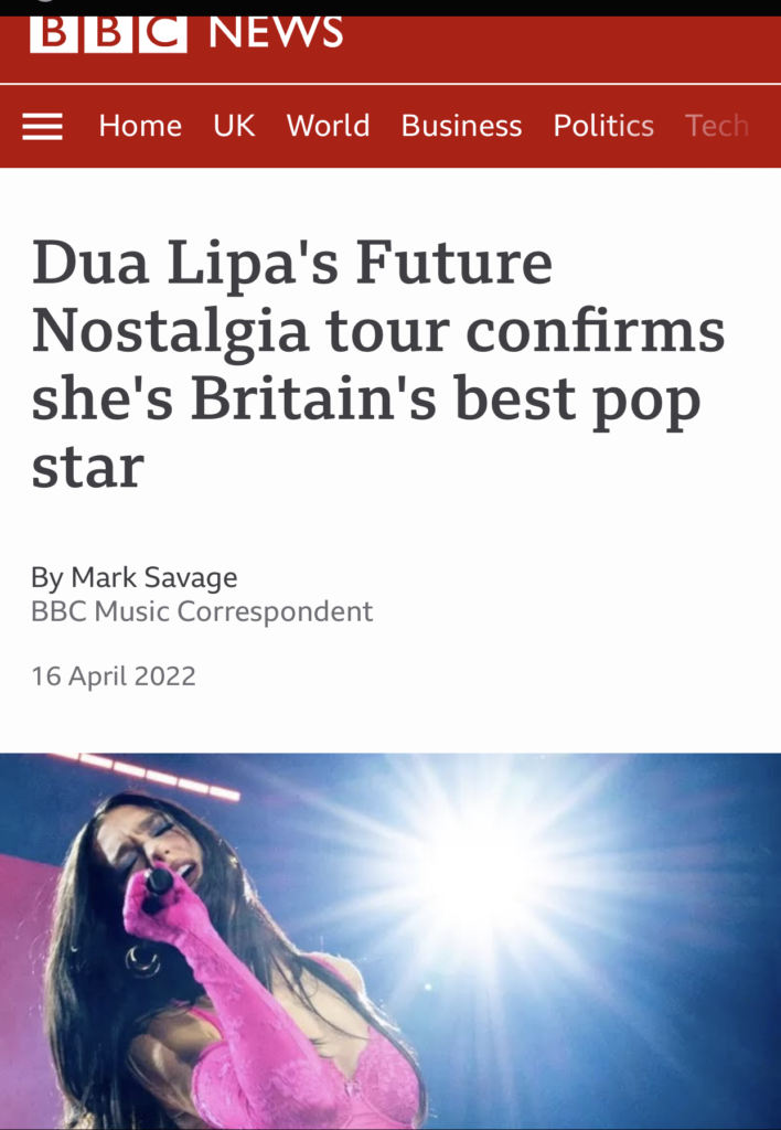 Dua Lipa ka shkëlqyer në turin e mbajtur të “Future Nostalgia”. Mediat e huaja dhe ato britanike kanë shkruar se Lipa është artistja më e mirë “pop star” dhe jo vetëm. Përveç zërit identifikues, Dua i ka plotësuar performancat e saj edhe me kërcime e momente pranë balerinëve që ka marrë vëmendjen e gjithë ndjekësve.