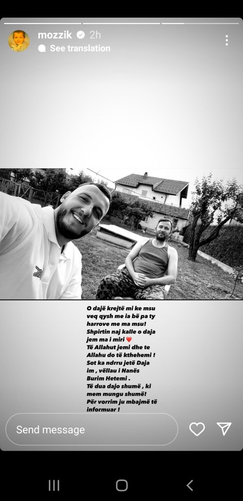 Ai shpreh pikëllimin për ngjarjen e ndodhur teksa thekson se do i mungojë shumë. “O daje krejte mi ke msu veg qysh me ia bè pa ty harrove me ma msu! Shpirtin naj kalle o daja jem mai miri. Te Allahut jemi dhe te Allahu do tè kthehemi! Sot ka ndrru jetè Daja im , vellau i nanes Burim Hetemi. Te dua dajo shume , ki mem mungu shume amo shumë- përfundoi Mozzik. Kurse Getinjo nuk është në dijeni për një gjë të tillë, sepse siç dihet ai tashmë është banor i shtëpisë së Big Brother VIP Kosova.