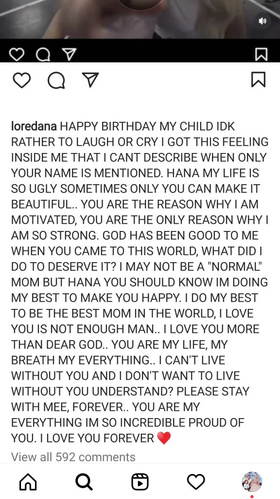 “Gëzuar ditëlindjen fëmija im. Nuk di të qesh apo të qaj, kam një ndjenjë përbrenda që nuk e përshkruaj dot kur përmendet emri yt. Hana jeta ime është shumë e shëmtuar ndonjëherë dhe vetëm ti mund ta bësh të bukur. Ti je arsyeja pse jam e motivuar, ti je e vetmja arsye pse jam e fortë. Zoti ka qenë i mirë me mua kur ti erdhe në këtë botë, çfarë bëra për ta merituar. Mund të mos jem një mama “normale” por Hana ti duhet ta dish që po bëj më të mirën time që të të bëj të lumtur. Bëj më të mirën që të jem mamaja më e mirë në botë. Të dua më shumë se Zoti i dashur. Ti je jeta ime, fryma ime, gjithçka e imja. Nuk mund të jetoj pa ty dhe nuk dua të jetoj pa ty. Të lutem rri me mua përgjithmonë, je gjithçka për mua”