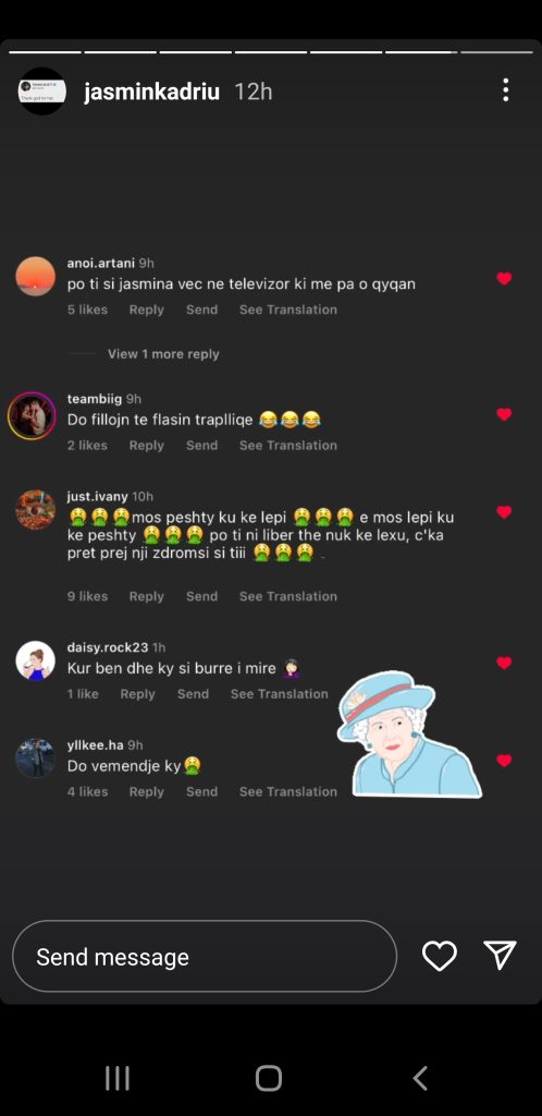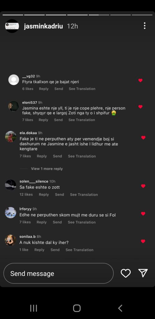 Pikërisht përmes komenteve ka reaguar edhe Jasmina, e cila ka ndarë disa prej tyre në Instastory, ku tregon se iu ka bërë edhe “like.”