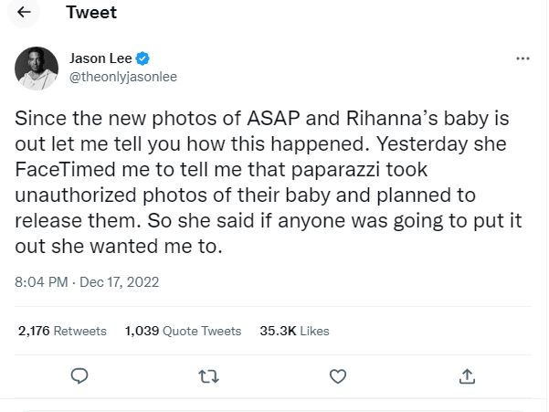 “Duke qenë se fotoja e bebushit të A$AP dhe Rihanna doli, më lejoni t’ju shpjegoj si ndodhi. Dje, ajo më mori në FaceTime dhe më tregoi se paparacët i bënë foto pa leje të djalit të saj dhe kishin planifikuar t’i publikonin ato. Kështu që ajo m’i besoi mua publikimin e fotove”– shkroi ai.