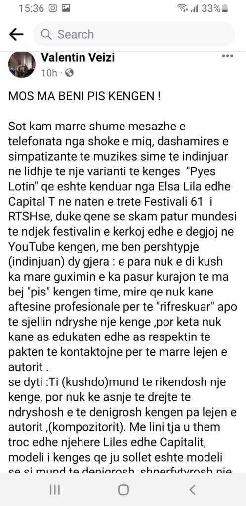 Sot kam marrë shumë mesazhe e telefonata nga shokë e miq, dashamirës e simpatizantë të muzikës sime të indinjuar në lidhje të një varianti të këngës “Pyes Lotin” që është kënduar nga Elsa Lila edhe Capital T në natën e tretë Festivali 61 i RTSH-së, duke qenë se s’kam patur mundësi të ndjek festivalin e kërkoj edhe e dëgjoj në YouTube këngën, më bënë përshtypje (indinjuan) dy gjëra : e para nuk e di kush ka marrë guximin e ka pasur kurajon të ma bej “pis” këngën time, mirë që nuk kane aftësinë profesionale për të “rifreskuar” apo të sjellin ndryshe një këngë, por këta nuk kanë as edukatën edhe as respektin të paktën të kontaktojnë për të marrë lejen e autorit .