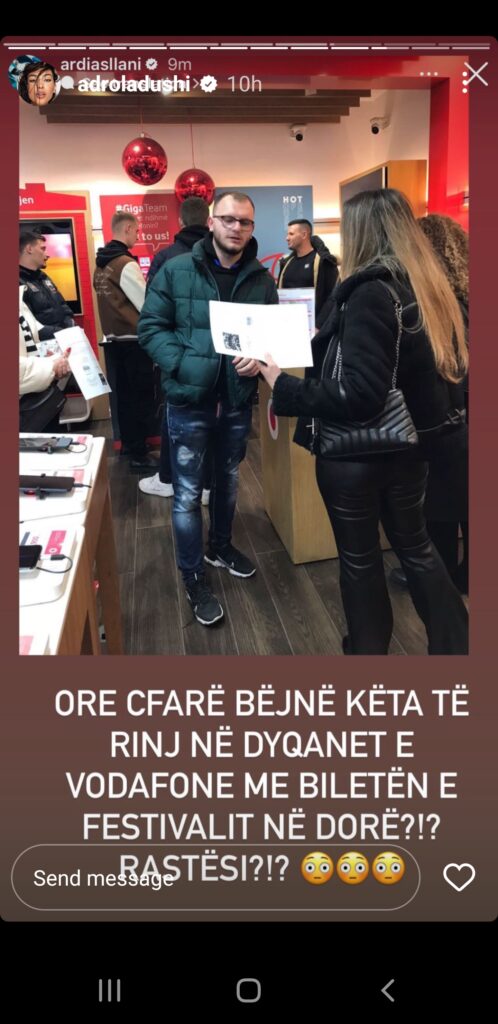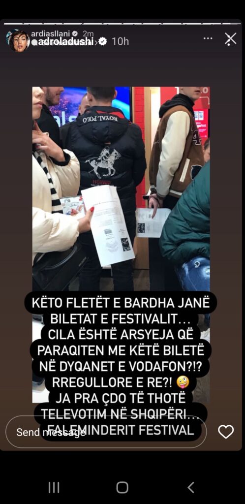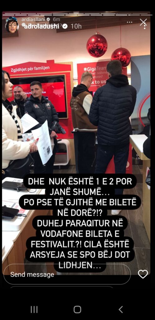 Në një tjetër imazh të kapur brenda dyqanit ajo shkruan, “Këto fletat e bardha janë biletat e festivalit… Cila është arsyeja që paraqiten me këtë biletë në dyqanet e Vodafon?!? Rregullore e re?! Ja pra ç’do të thotë televotim në Shqipëri. Faleminderit festival.”