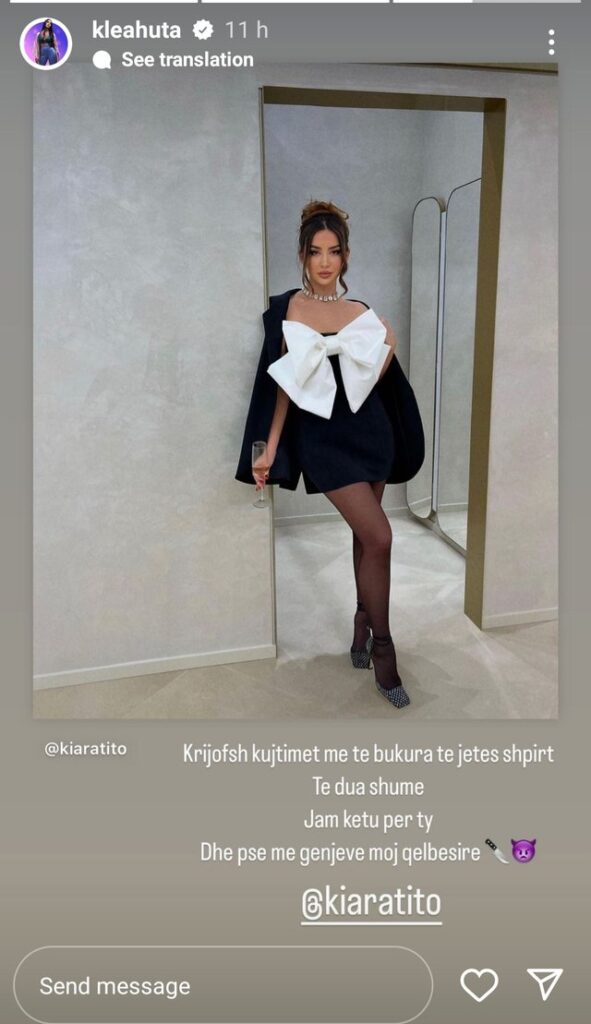 Teksa në monitor u shfaq klipi i saj prezantues para se të futej në shtëpinë më të famshme, moderatorja bukuroshe u shpreh se pjesëmarrjen e saj në reality show-n e njohur nuk e ka marrë vesh askush, përveç familjarve të saj. E kështu paska qenë, pasi duket se moderatorja është treguar e rezervuar për të ndarë lajmin emocionues edhe me miqtë e saj duke ua lënë atyre si surprizë për t’a zbuluar në natën e parë të nisjes së këtij spektakli. Një ndër to mesa duket ka qenë edhe Klea, e cila ka postuar një foto të Kiarës në Instastory, ku përveç se sigurisht i kishte uruar shumë fat dhe suksese, nuk mund të mos e përmendte faktin që e kishte gënjyer, duke e quajtur kështu në një sens shakaje ‘qelbësirë’.