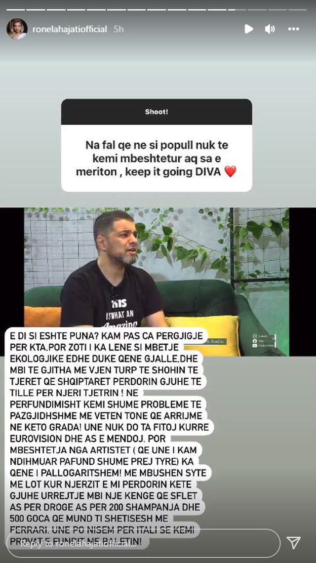 Ronela shprehet falenderuese për mbështetjen që ka pasur nga artistët dhe kritikon ata që përdorin gjuhë urrejtje ndaj këngës së saj që nuk flet “as për drogë dhe as për 500 goca që mund t’i shëtisësh me Ferrari”.