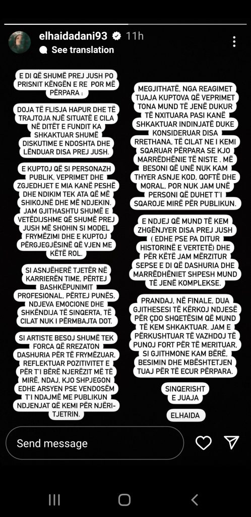 Deklarata e plotë e Elhaidës: “E di që shumë prej jush po prisnit këngën e re, por më përpara: Doja të flisja hapur dhe të trajtoja një situatë e cila në ditët e fundit ka shkaktuar shumë diskutime e ndoshta dhe lënduar disa prej jush. E kuptoj që si personazh public, veprimet dhe zgjedhjet e mia kanë peshë dhe ndikim tek ata që më ndjekin. Jam gjithashtu shumë e vetëdijshme që shumë prej jush më shohin si model frymëzimi dhe e kuptoj përgjegjësinë që vjen me këtë rol. Si asnjëherë tjetër në karrierën time, përtej bashkëpunimit profesional, përtej punës, ndjeva emocione dhe shkëndija të sinqerta, të cilat nuk i përmbajta dot. Si artiste besoj shumë tek forca që rrezaton dashuria për të frymëzuar, reflektuar pozitivitet e për t’i bërë njerëzit më të mirë, ndaj kjo shpjegon edhe arsyen pse vendosëm t’i ndajmë me publikun ndjenjat që kemi për njëri-tjetrin. Megjithatë, nga reagimet tuaja kuptova që veprimet tona mund të jenë dukur të nxituara pasi kanë shkaktuar indinjatë duke konsideruar disa rrethana, të cilat ne i kemi sqaruar përpara se kjo marrëdhënie të niste. Më besoni që unë nuk kam thyer asnjë kod, qoftë dhe moral, por nuk jam unë personi që duhet t’i sqarojë mirë për publikun. E ndjej që mund të kem zhgënjyer disa prej jush (edhe pse pa ditur historinë e vërtetë) dhe për këtë jam mërzitur sepse e di që dashuria dhe marrëdhëniet shpesh mund të jenë komplekse. Prandaj në finale dua gjithsesi të kërkoj ndjesë për çdo shqetësim që mund të kem shkaktuar. Jam e përkushtuar të vazhdoj të punoj fort për të merituar, siç gjithmonë kam bërë, besimin dhe mbështetjen tuaj për të ecur përpara. Sinqerisht e juaja Elhaida”