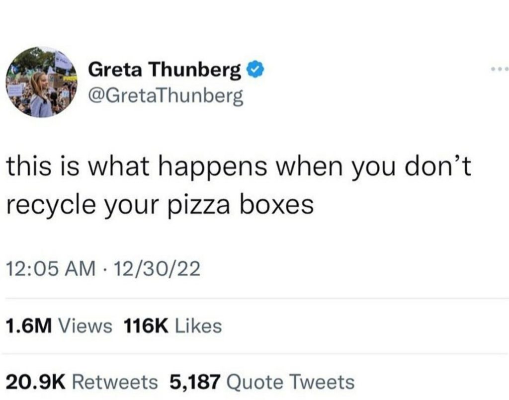 Ajo shkroi në Twitter këtë mëngjes: “Kjo është ajo që ndodh kur nuk i ricikloni kutitë tuaja të picave”, duke iu referuar raportimeve se policia u informua për vendndodhjen e Tate-it në Bukuresht pasi ai publikoi një video të tij të ulur pranë një kutie picash të një kompanie rumune, shkruan DailyMail.