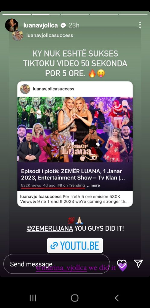 Ndonëse disa javë më pas, Luana iu përgjigju Noizy-t, duke ripostuar në profilin e saj një postim të një fanses së saj ku shkruhet: “Ky nuk është sukses Tik-Tok-u video 50 sekonda por 5 orë”, ku tregohet se episodi i fundit i emisionit të saj ka kaluar 500 mijë klikime në Youtube.