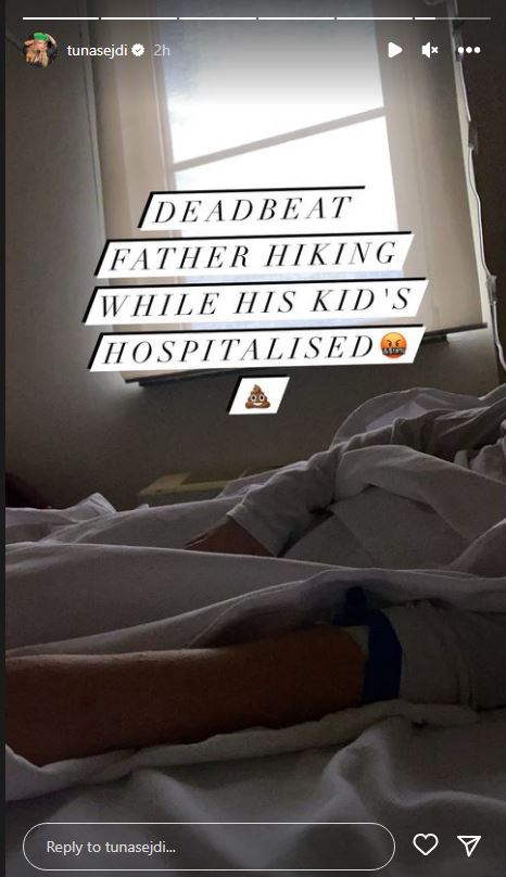 E duket se pas postimeve nga ana e artistes, ish- partneri i saj dhe njëkohësisht babai i fëmijëve ka vizituar të birin i cili ndodhet në spital. Këtë moment Tuna e ka fotografuar dhe e ka ironizuar keqazi duke shkruajtur krahas fotos: “Oooo hi babush” dhe i vendosi një ’emoji’ që simbolizon letrën higjienike.