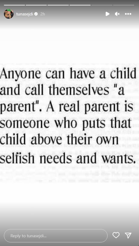 Mirëpo së fundmi, Tuna bëri një deklaratë të fortë ndaj ish-partnerit të saj, ku e akuzon se vendos ‘qejfet’ e tij para shëndetit të fëmijëve. Me anë të një postimi në InstaStory, artistja publikoi fillimisht një shkrim në anglisht ku thuhej:
