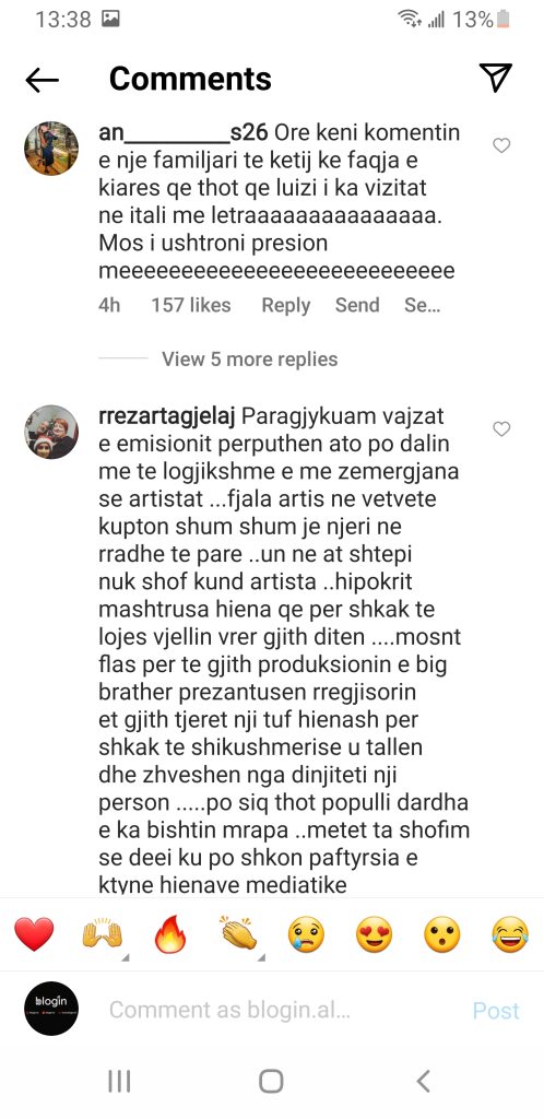 Nga ana tjetër rrjeti është ndare në dy anë: Ata të cilët e mbështesin Luizin dhe ata të cilët janë tyë shokuar nga kjo situatë. Mirëpo më rrjetet sociale shihet se dominon një numëri madh komëntesh të cilët i dalin në mbrojte këngëtarit. Madje disa prej tyre e kanë krahasuar me edicionin e vitit të kaluar në “BBVIP”, ku Donaldi u ‘sulmua’ nga produksioni për lidhjen e tij me Beatrix.